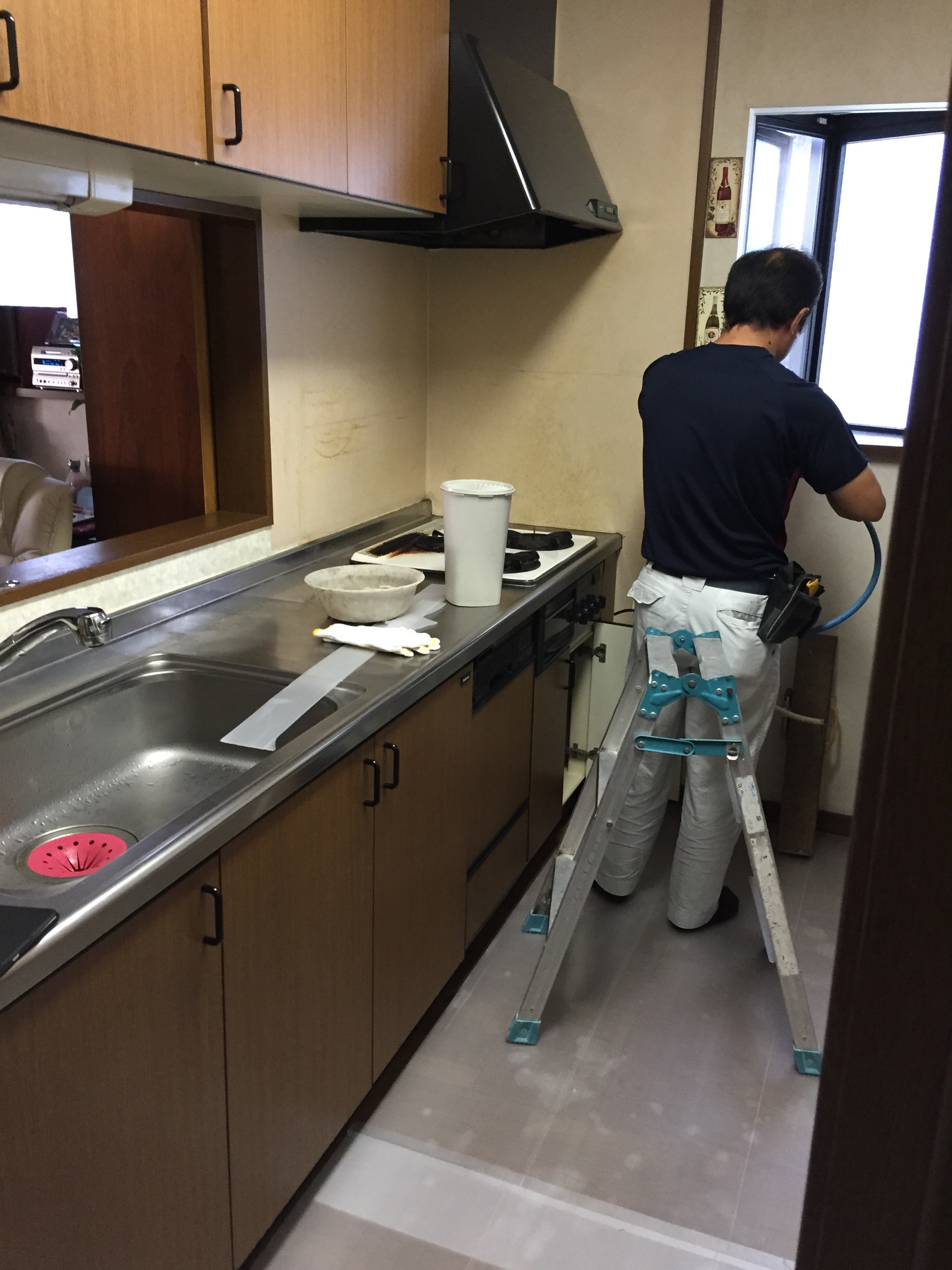 パネルを貼ってキッチンを組立て電気、ガス、水道の配管を繋いで
